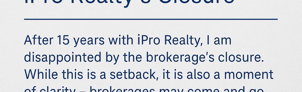 After 15 years with iPro Realty, I never imagined I’d be writing this post. The recent closure of the brokerage has left me — and many of my colleagues — both surprised and disappointed. Like so many agents who invested years of their careers with iPro, I’m now facing the inconvenience of selecting a new brokerage, navigating administrative hurdles, and preparing for the possibility of lost income during the transition.